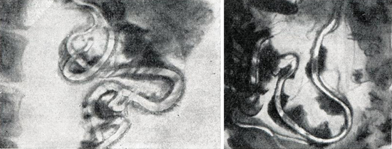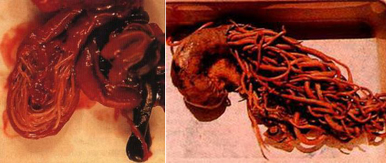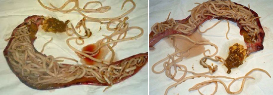 Рис. 12. Аскариды в кишечнике. Скопления гельминтов приводит к механической кишечной непроходимости.