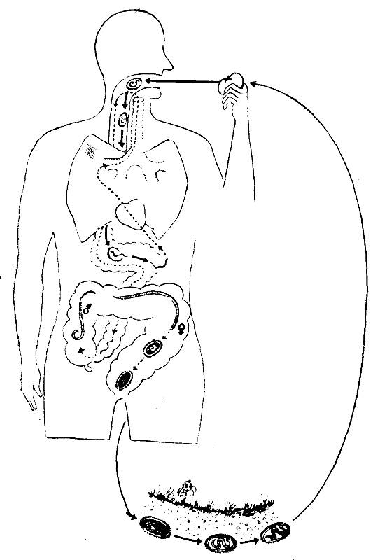 Проглоченное яйцо попадает в кишечник, где инвазионная личинка, освободившись от яйцевых оболочек, пробуравливает слизистую оболочку кишечника, мелкие венозные сосуды и с током крови попадает в воротную вену, сосуды печени, затем в нижнюю полую вену и правую половину сердца. Проходя по легочным капиллярам, личинка пробуравливает их и с излившейся кровью попадает в легочные альвеолы и бронхиолы. Мерцательный эпителий дыхательных путей способствует ее продвижению в бронх, трахею и глотку. Попав затем в рот, личинка может быть проглочена вместе со слюной. Развитие аскарид от вылупившейся из яйца личинки до первой откладки яиц колеблется от 9 до 15 нед.