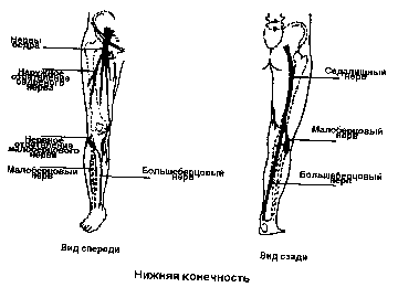 Главная бедренная артерия проводит через лобковую кость и разветвляется. Одна ветвь идет вокруг наружной стороны коленного сустава и проходит через переднюю сторону большеберцовой кости к верхней части стопы. Артерия сзади большеберцовой кости переходит и артерию малоберцовой кости и тянется до нижней части стопы. Важные нервы ноги идут от пояса через центр таза и вниз по ногам. Седалищный нерв спускается по задней стороне ноги. Он разделяется на больщеберцовый и малоберцовый нервы. Больщеберцовый нерв приходит сзади колена и идет вниз по икре, проходя внутри пятки и заканчивается в нижней части стопы. Малоберцовый нерв проходит рядом с коленом, вниз по голени и закапчивается в верхней части стопы.