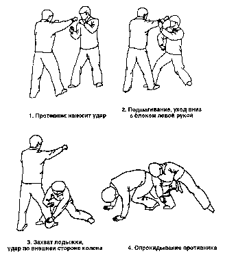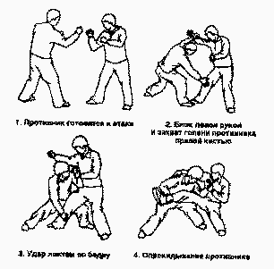 Противник атакует правым кулаком. Сделав шаг правой ногой вперед, выполните блок с внутренней стороны и, одновременно нанесите удар правой рукой в голову оппонента. Он будет вынужден защищаться, используя левую руку. Теперь быстро наклонитесь вперед и, захватив обе ноги противника, потяните их на себя. При этом необходимо плечом толкать оппонента в живот вперед.
