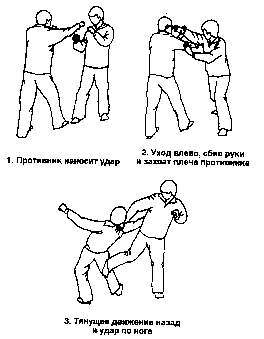 Противник атакует правым кулаком. Сделайте шаг правой ногой вперед, выполните блок левой ладонью с внешней стороны и, присаживаясь вниз, захватите правую лодыжку оппонента. Одновременно поверните корпус вправо и нанесите сильный удар локтем или предплечьем по внешней стороне коленного сустава, сгибая его и выворачивая внутрь.