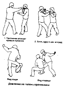 Противник атакует правым кулаком. Сделайте шаг правой ногой вперед и, присаживаясь, захватите левой кистью правую лодыжку оппонента. Одновременно правой рукой нанесите удар по внутренней стороне коленного сустава этой же ноги. После удара продолжайте давить на колено, при этом своей левой рукой тяните ногу противника па себя.