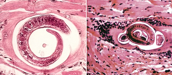 Живые личинки по лимфатическим и кровеносным сосудам разносятся по всему организму хозяина и оседают в мышечной ткани.