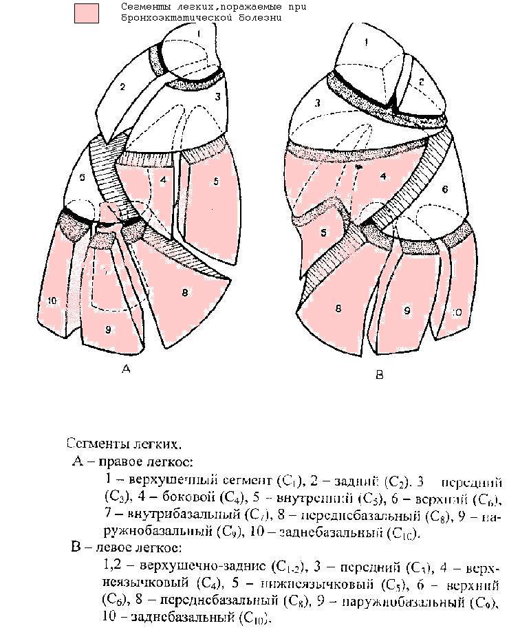 Пациент должен быть осведомлен, какое легкое и какие его отделы поражены. От этого будет зависеть поза, в которой улучшится отхождение мокроты из пораженных бронхов под действием гравитационных сил (сегменты легких,которые поражаются наиболее часто, показаны на рисунке).