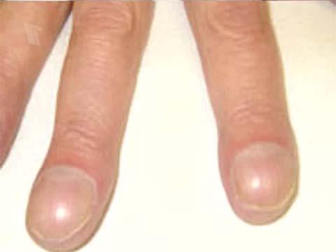 Для пациентов с бронхоэктатической болезнью характерно изменение пальцев рук: пальцы приобретают вид «барабанных палочек» — концевые фаланги пальцев утолщаются. Ногти могут принимать вид «часовых стекол»: становятся выпуклыми, ногтевая пластина – округлой и толстой.