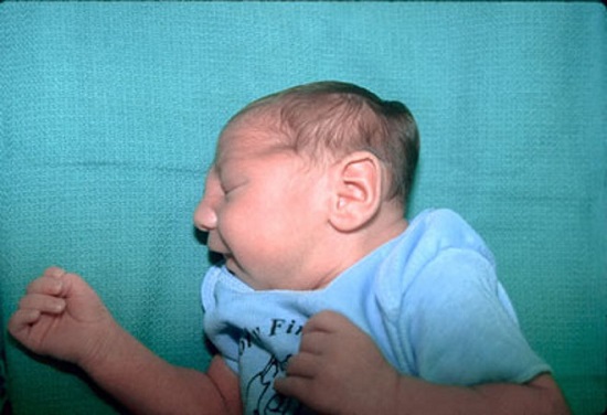 Отметим, опять же, что внешне больные микроцефалией дети отличаются скошенным и узким лбом, большими ушами и надбровными дугами, расположенными в несколько выступающем положении. Закрытие родничков и черепных швов происходит в течение первых месяцев жизни, бывает и так, что к моменту рождения они уже закрыты. Последующее развитие больного ребенка сопровождается отсталостью в росте и в весе, причем такие изменения могут обусловить карликовость. Телосложение становится непропорциональным, нёбо высокое и узкое, зубы больших размеров, редкие.
