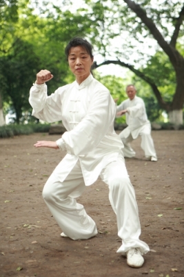 4. Стопы перемещают инь-ян. Кисти кладут на поясницу (большими пальцами назад), поднимают левую ногу (бедро поднимают до тех пор, пока с горизонтальной плоскостью на образуется угол 45 #, голень перпендикулярна земле, голеностопный сустав расслаблен), пинают левой ногой (левый носок оттягивают, так что он образует прямую линию с ногой)