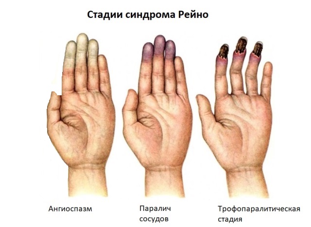 Клиническое течение синдрома рейно, симптомы которого распределены по стадиям, протекает в виде прогрессирующего процесса: