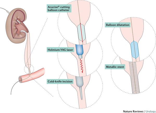 В настоящее время у специалистов нет общего мнения касательно выбора основного метода лечения пациентов со стриктурами мочеточника . Хирургические вмешательства при стриктуре включают: