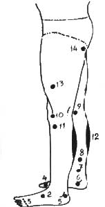 - Точки 13 выкоснетесь кончиком среднего пальца, если, стоя, свободно опуститеруки вдоль туловища. Показания: нервное напряжение, радикулит, слабость мышц бедра.