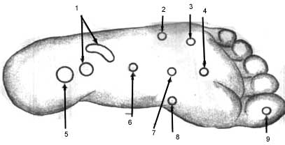 - Массаж точки 1 (см. рис.) на ноге поможет снять судороги икроножной мышцы, общее нервное напряжение, избавитьсяот бессонницы, он поможет при нарушении функции почек и мочевогопузыря, при ночном недержании мочи.
