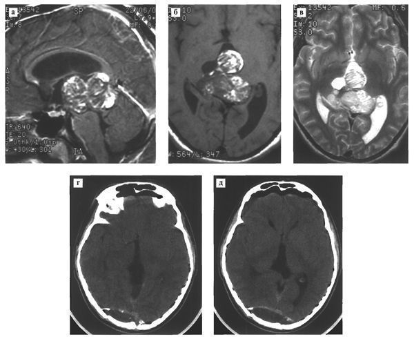 Рис.120. МРТ в режимах Т1 с контрастным усилением (а,б) и Т2 (в) выявляет гетерогенного строения опухоль больших размеров, практически полностью занимающую весь третий желудочек. Средний мозг грубо сдавлен и деформирован. КТ (г,д) после удаления опухоли затылочным транстенториальным доступом не выявляет се остатков. Под костным лоскутом в затылочной области определяется эпидуральная гематома.