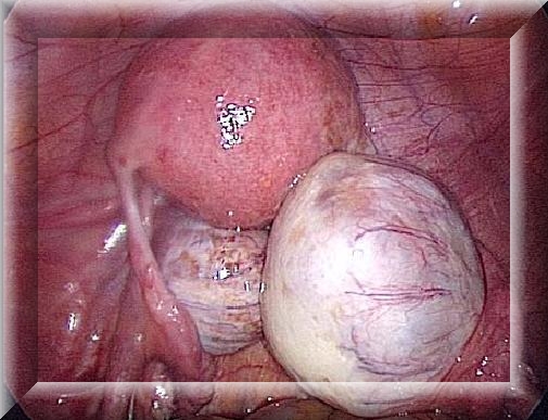 - Лапароскопии. Специальный оптический прибор вводится через брюшную стенку в полость живота для осмотра яичника и тридермомы. Зрелая опухоль на длинной тонкой ножке (бело-жёлтого цвета) чаще всего определяется между мочевым пузырём и маткой. Незрелая тератома обнаруживается сбоку от матки, имеет неоднородную консистенцию и неправильную форму.