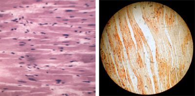 Рис. 12. На фото картина поражения сердца при дифтерии. Слева — нормальный миокард. Справа — резко выраженная жировая дистрофия миокарда («тигровое сердце»).