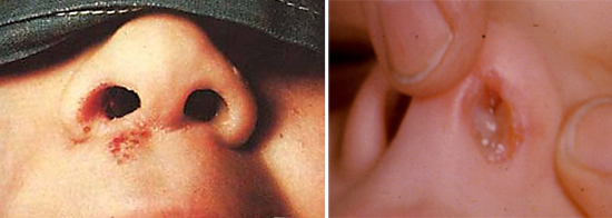 Рис. 11. На фото дифтерия носа. На коже верхней губы видны эрозии и трещины. В полости носа — дифтерийные пленки.