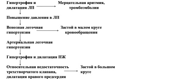 В расширенном предсердии легко образуются тромбы, которые попадают в головной мозг, коронарные артерии, сосуды других органов, вызывая их инфаркты. Кроме того, нарушается внутрисердечная проводимость и возникает фибрилляция предсердий.