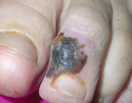 Акральная лентигинозная меланома на пальце ноги. Имеет признаки черного пятна, с неравномерной переходной черно — серой окраской. Увеличивается со временем.