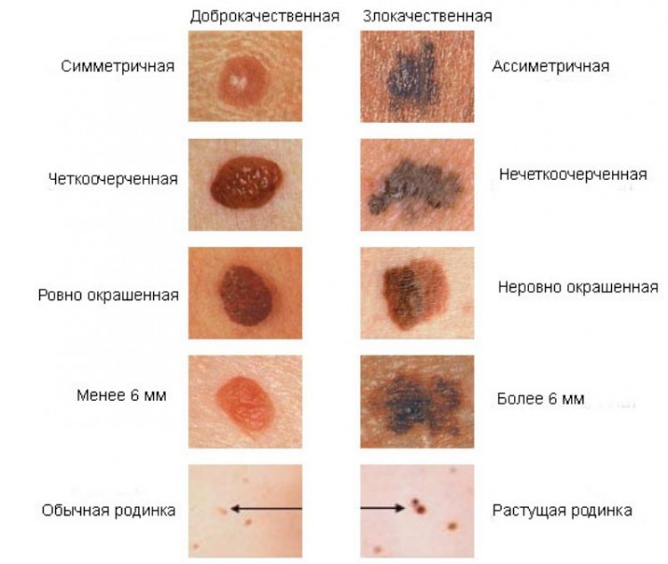 В первую очередь, необходимо обратить внимание на них. Существующие правила для определения подозрительных родинок (симметрия, границы, цвет, размеры, изменения) подходят и для меланомы