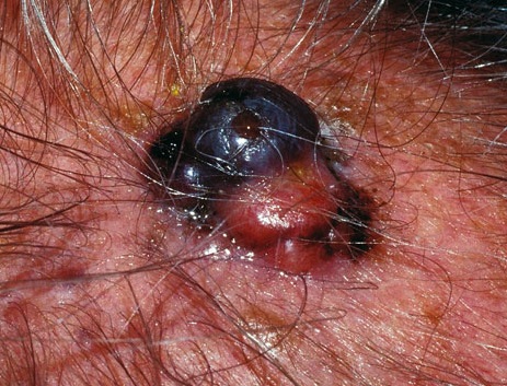 Узловая меланома имеет признаки черной бугристой родинки. Виден участок розового цвета. Периодически выделяется кровь. Не болит, почти не беспокоит.