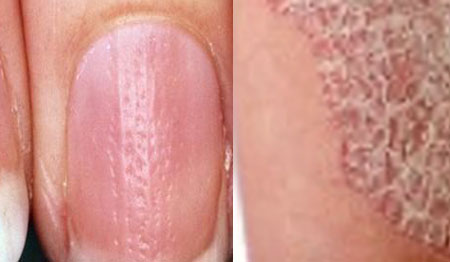 - Наличие поражения ногтей при псориазе. Ногтевые пластинки – это «переходная ткань» между кожей и суставами, и в случае их заинтересованности поверхность ногтевой пластинки становится покрыта мелкими ямками, которые хорошо видно в отраженном свете. Ногти становятся похожими на поверхность наперстка (см. фото 1);