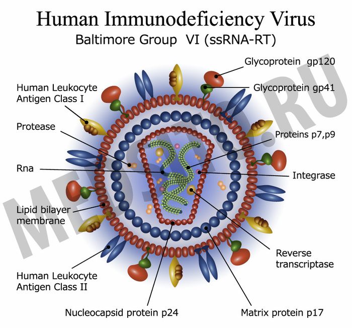 В составе ВИЧ вирусные РНК и тройка ферментов: ревертаза, интеграза и протеаза – все они в упаковке с белками. Снаружи – молекулы матриксного р-17- белка. Место их расположения – пространство между капсидом и мембраной. Внутри клетки располагается белок Vhr.