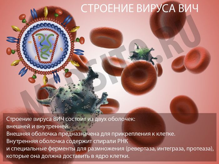 Вирус, являющийся провокатором ВИЧ-инфекции – ретровирус, имеющий форму сферы. Внешняя оболочка, посредством которой происходит взаимодействие вируса с иммунными клетками организма, частично состоит из белков.