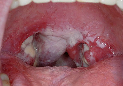 При осмотре миндалин отмечается их значительное увеличение и наличие желто-белого гнойного налета или беловатых пузырьков (фолликулов).