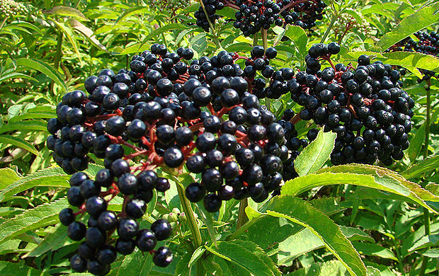 Плоды бузины — мелкие черные ягоды с красным соком. Период созревания ягод август — сентябрь.